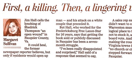 I am grateful to Margaret Sullivan and The Washington Post for the story about me in today’s paper. Sullivan is the media columnist, and her work usually appears in the Style section. When she called, she said my experience with The Last Lynching in Northern Virginia was not the type she usually writes about–her most recent columns were about Bill O’Reilly and Facebook–but she thought it was interesting, and her editors agreed.