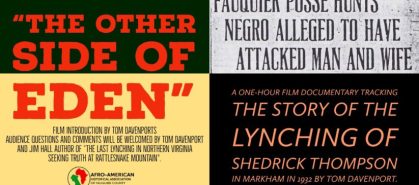 Saturday, Feb. 10, 2018, 2 p.m., joint appearance with filmmaker Tom Davenport for book talk and screening of his film, The Other Side of Eden. Afro-American Historical Association of Fauquier County, 4243 Loudoun Ave. The Plains, Va.