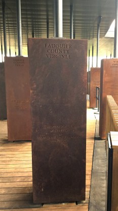 Her photos include one of a suspended, coffin-like steel monument, inscribed to Fauquier County, Virginia. On the monument are the names of Arthur Jordan, who was lynched in Warrenton in 1880, and Shadrack (Shedrick) Thompson, who was lynched on Rattlesnake Mountain in northern Fauquier in 1932. (I played a small part in the inclusion of Thompson’s name at the memorial. In 2015, I asked the Equal Justice Initiative, the sponsors of the memorial, if he was in their database. They replied that he was not, and they asked for supporting information. They studied the material I sent and decided to include him in their list of lynching victims and to place his name on their memorial.)